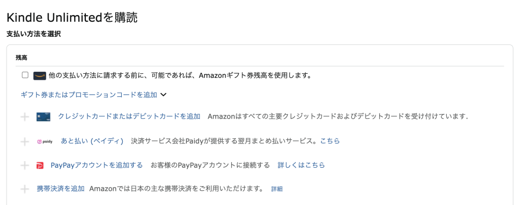 4. 支払い方法を確認(クレジットカード、携帯決済、Amazonギフト券など)